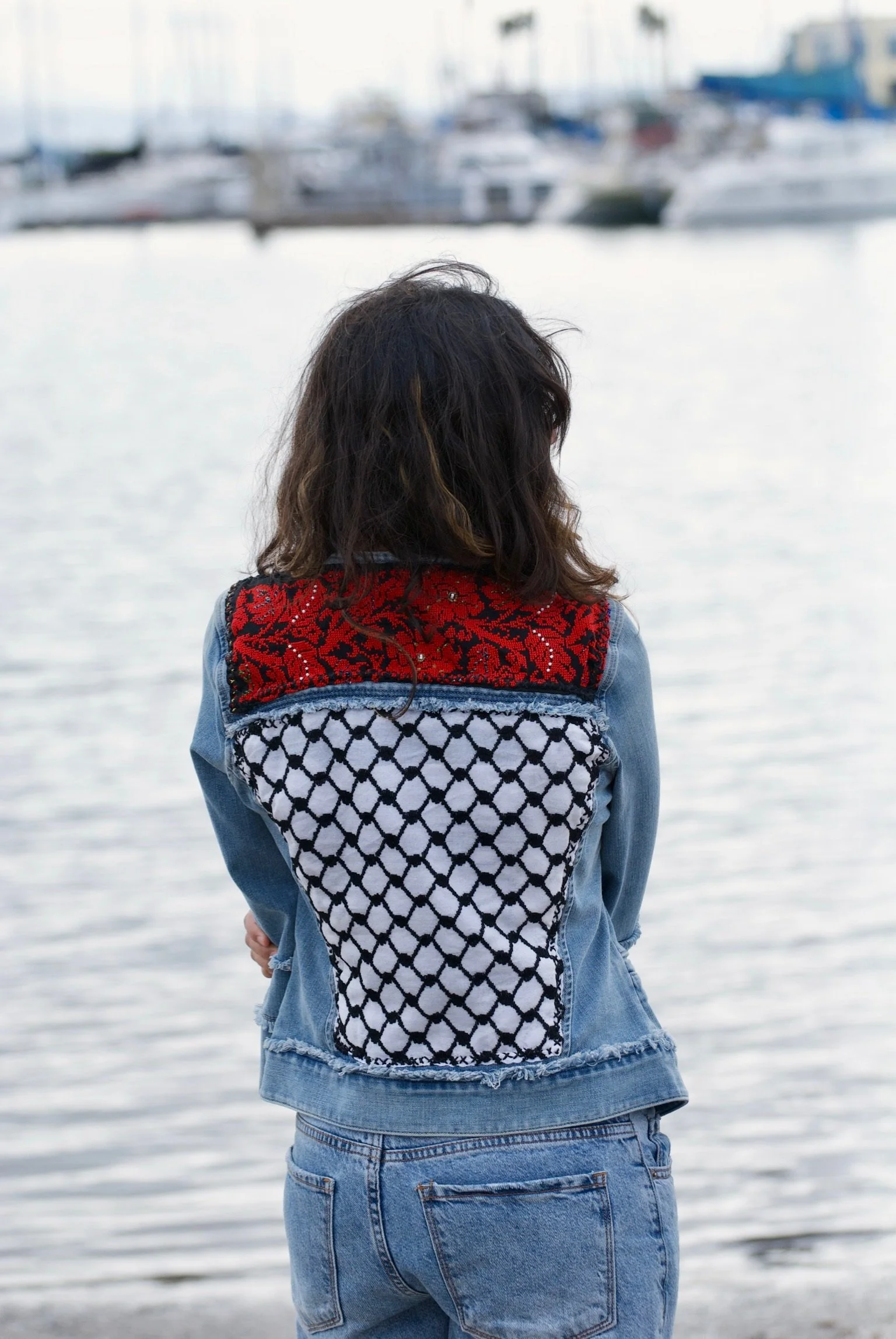 Image 1 of 5 Image 2 of 5 Image 3 of 5 Image 4 of 5 Image 5 of 5 Blue denim jacket with fringe detail, Tatreez and Keffiyeh (Extra Small) $250.00 sold out Blue denim zip-up jacket with fringe detail, Tatreez, and black & white Keffiyeh back (Extra Small) Sold Out Added! Blue denim zip-up jacket with fringe detail, Tatreez, and black & white Keffiyeh back (Extra Small) Reviews Reviewer Name Review Date Star Rating Description Posted on Etsy Product Show More